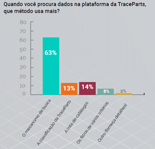 De acordo com uma pesquisa recente entre os acessos ao nosso site, a maioria das pessoas (63%) usa o mecanismo de busca da TraceParts para encontrar os dados CAD necessários. Profissionais de projeto preferem pesquisar no catálogo de um fornecedor (14%) ou na classificação da TraceParts, ou seja, por família de produtos (14%).