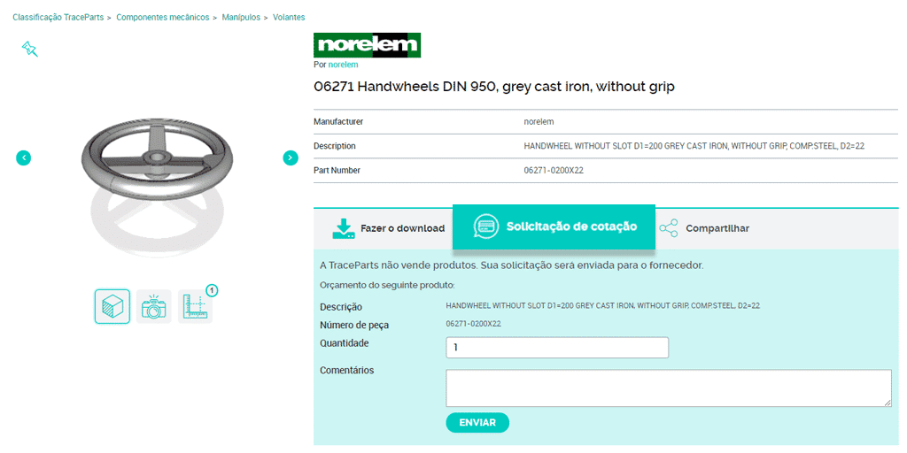 Depois de fazer login, os profissionais de projeto registrados na plataforma TraceParts podem solicitar um orçamento. O botão os leva a um formulário contendo o nome do produto, o número de peça e a quantidade necessária. Eles também podem adicionar comentários para acompanhar a solicitação.
