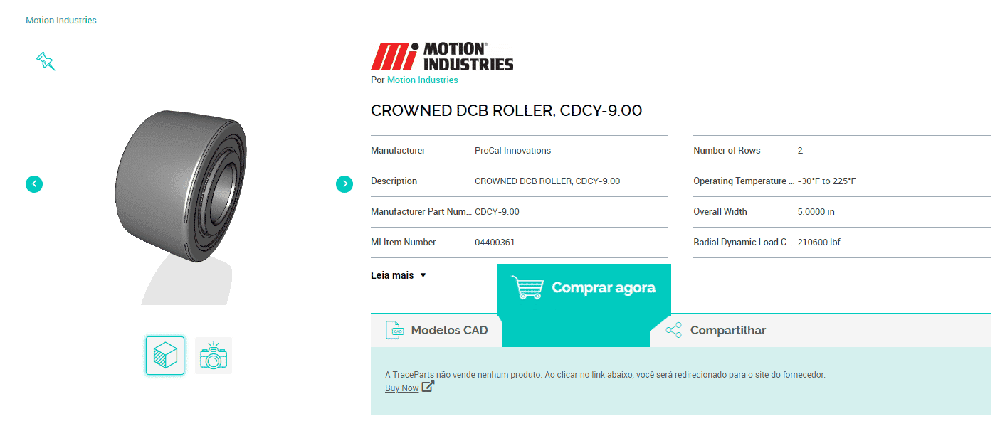 Para cada catálogo de peças publicado em www.traceparts.com com esse recurso, o botão “Comprar” pode ser visto por todos os engenheiros e projetistas que acessam as fichas técnicas de produtos.