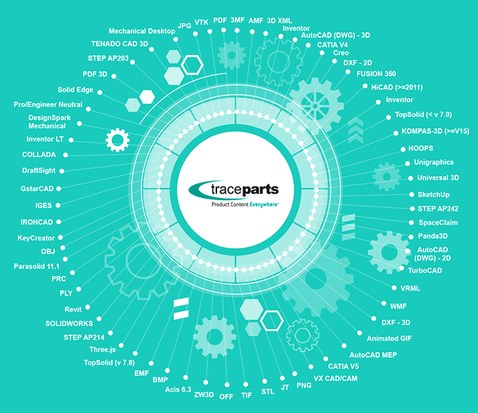 Os catálogos desenvolvidos com a tecnologia exclusiva da TraceParts oferecem modelos nativos e compatíveis com vários CAD que podem ser integrados de forma transparente para praticamente qualquer sistema CAD utilizados pelos seus clientes.