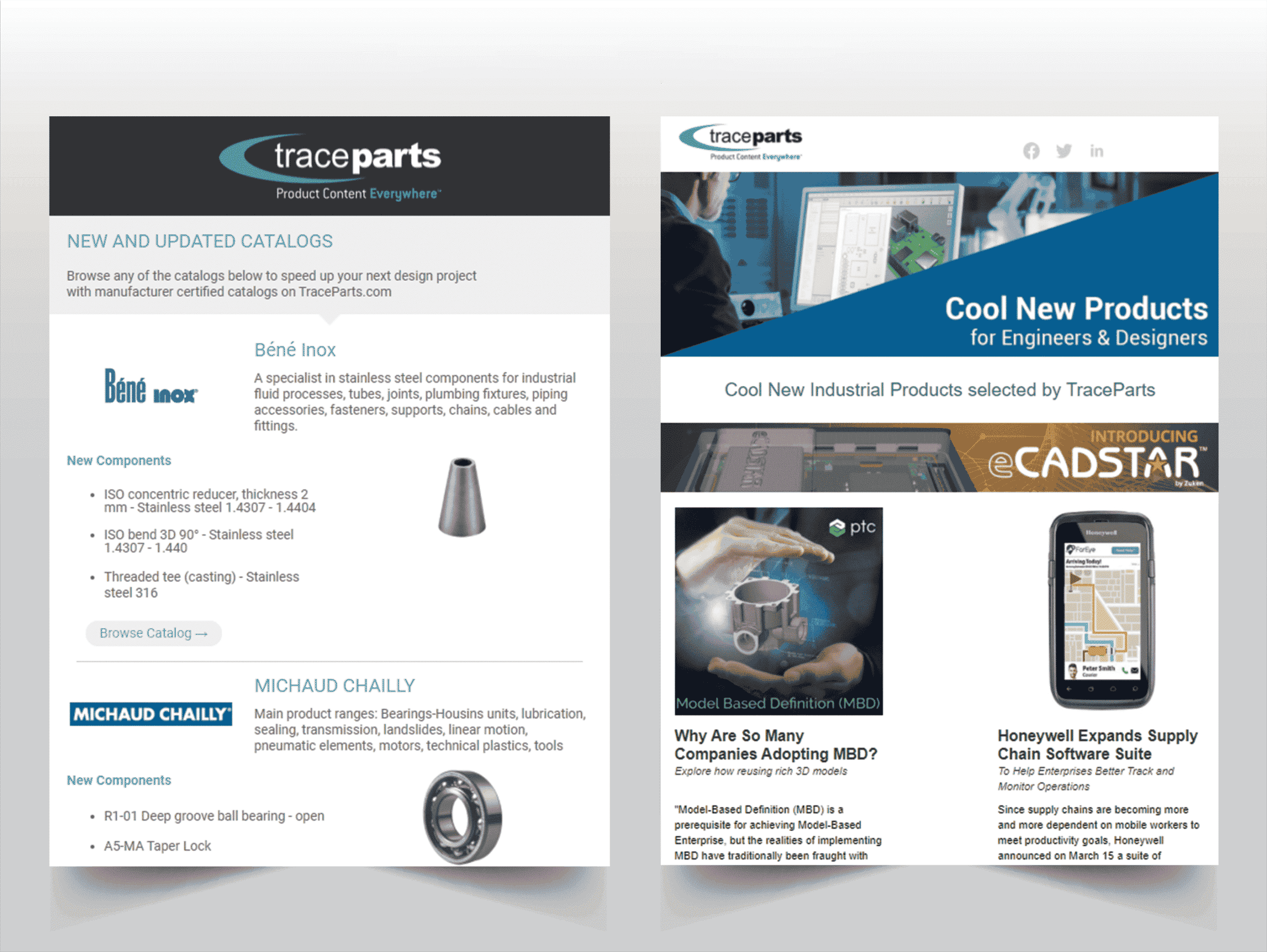 Der TraceParts Newsletter Kataloge präsentiert die neuen und aktualisierten Kataloge, die zum kostenlosen Download auf TraceParts.com zur Verfügung stehen. Außerdem bietet er wertvolle Inhalte für Ingenieure und Planer.