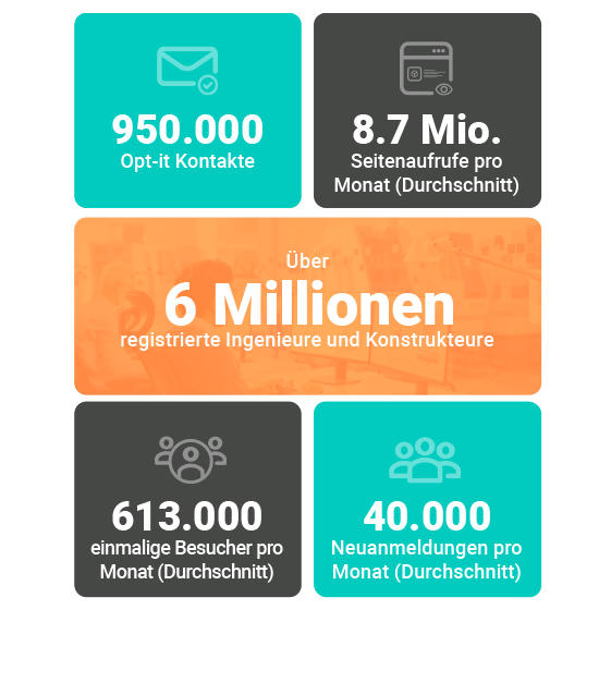 - Zielgruppenorientiertes E-Mail-Marketing: Wählen Sie Ihre Opt-in-Zielgruppe aus über 950,000 Ingenieuren und -Konstrukteuren. Generieren Sie Leads, steigern Sie den Website-Traffic oder bewerben Sie Ihre Produkte.