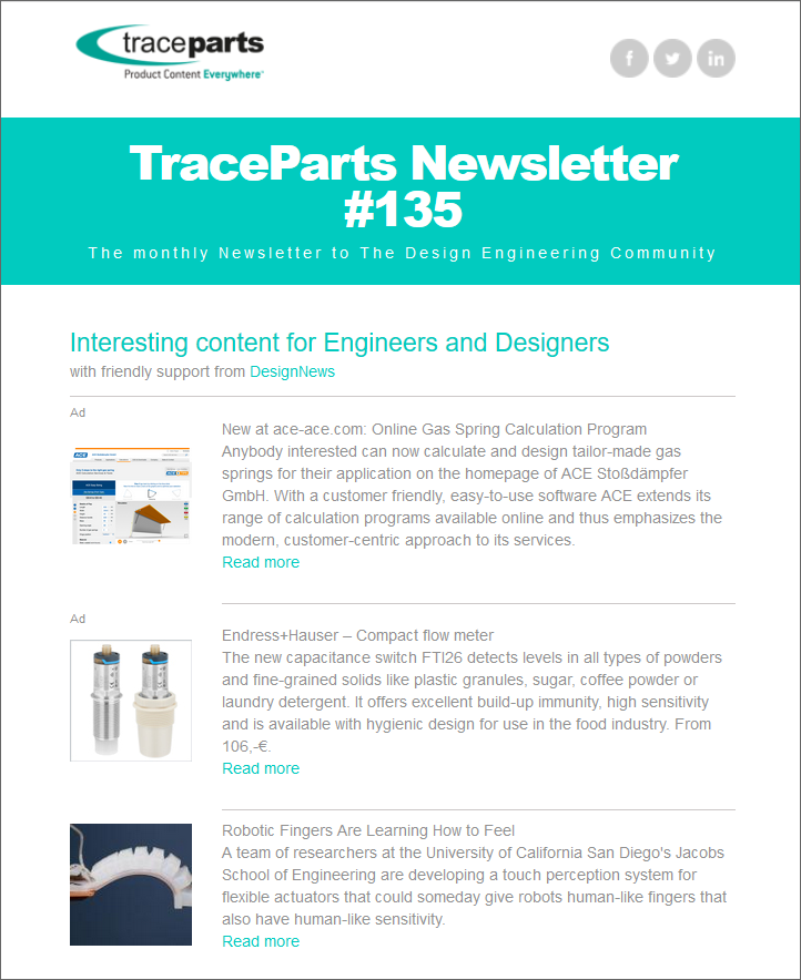 Der TraceParts Katalognewsletter mit weltweit 700.000 Abonnenten informiert die Konstrukteurs-Community monatlich über neue und aktualisierte CAD-Modelle auf unserer Plattform und ist zudem mit branchenrelevanten Nachrichten angereichert.