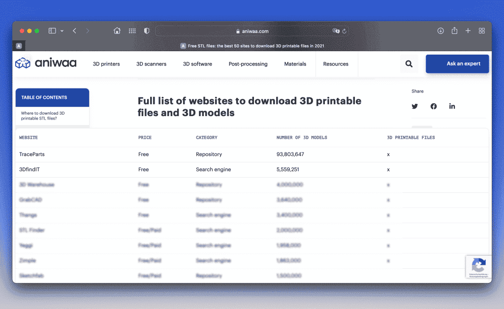 Aniwaa, der Anbieter einer umfassenden Vergleichsplattform für 3D-Drucker, 3D-Scanner und Software für die additive Fertigung, hat eine Liste von Portalen, Marktplätzen sowie Suchmaschinen veröffentlicht, über die druckfähige STL-Dateien bezogen werden können.