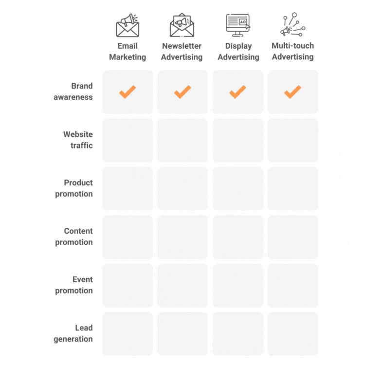 - Multi-Touch Advertising Across Channels: Maximize reach through targeted ads, email campaigns, and more – ensuring your brand is visible across multiple channels at every stage of the buyer journey.
