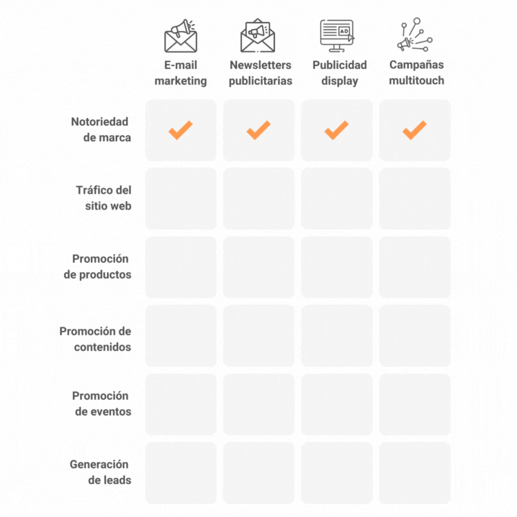 - Publicidad multi-touch omnicanal: Maximice su alcance mediante anuncios dirigidos, campañas de email y mucho más para asegurarse de que su marca es visible en múltiples canales y en cada una de las etapas del viaje del cliente.