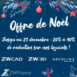 ZW France, distributeur des logiciels ZWCAD (alternative n°1 à AutoCAD©), ARCHLine (alternative REVIT©) et ZW3D (alternative à Solidworks©, Catia©, Inventor©, Solid Edge©), vous présente son offre de Noël ! Bénéficiez de -20 à -40% sur l’achat de nos logiciels CAO, FAO et BIM jusqu’au 23/12/22. Logiciels disponibles en licence perpétuelle : une licence à vie sans abonnement avec des mises à jour facultatives !