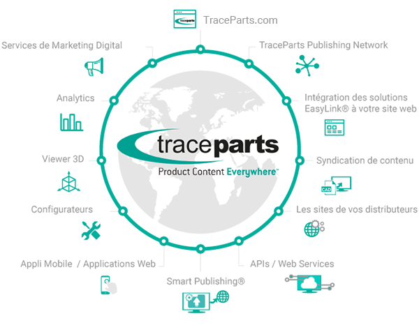 - Publication de vos produits sur la plateforme de contenu CAO TraceParts et sur le réseau de sites et d’applications partenaires TraceParts Publishing Network.