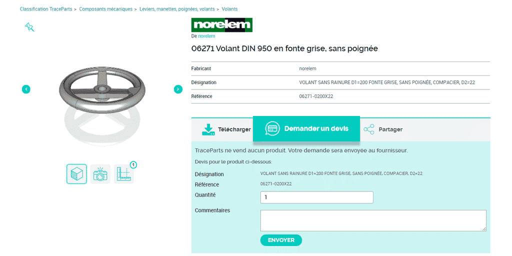 La fonction demande de devis remporte un vif succès auprès des concepteurs et ingénieurs car dès qu’ils ont trouvé le modèle CAO de la pièce qu’ils souhaitent intégrer dans un projet de conception, ils peuvent obtenir un prix.