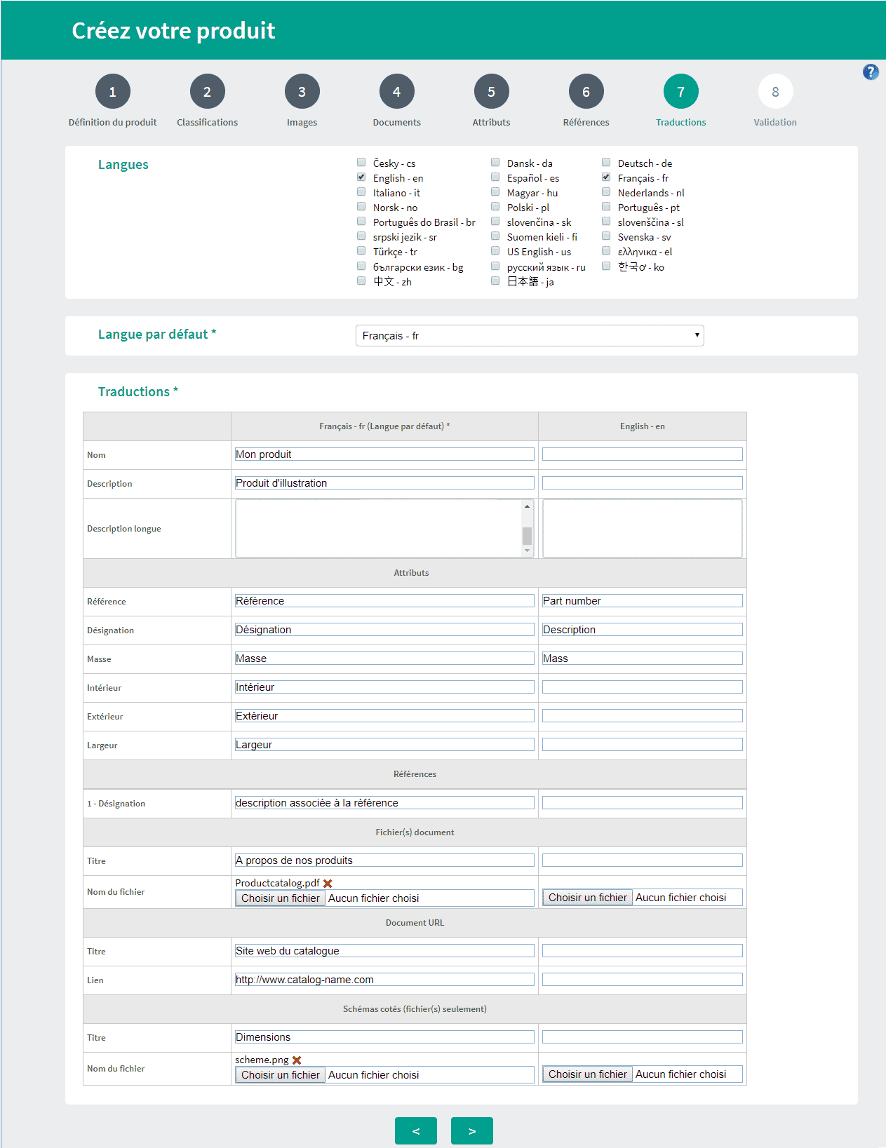 Cette étape vous permet de traduire les données de votre produit et fournir les documents dans les diverses langues supportées par votre produit.