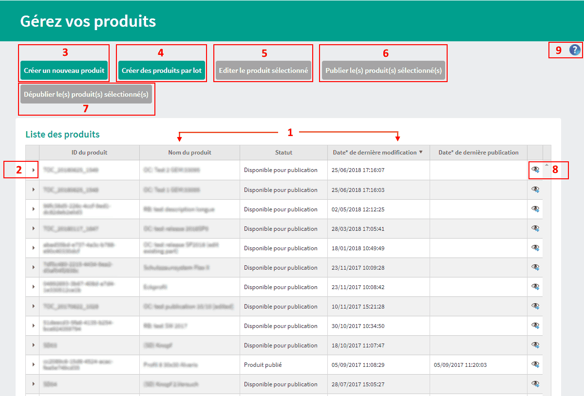 Pour tester un produit avant de le publier, vous pouvez le visualiser en cliquant dans la liste des produits l’icône (8) présente sur la ligne de ce dernier.