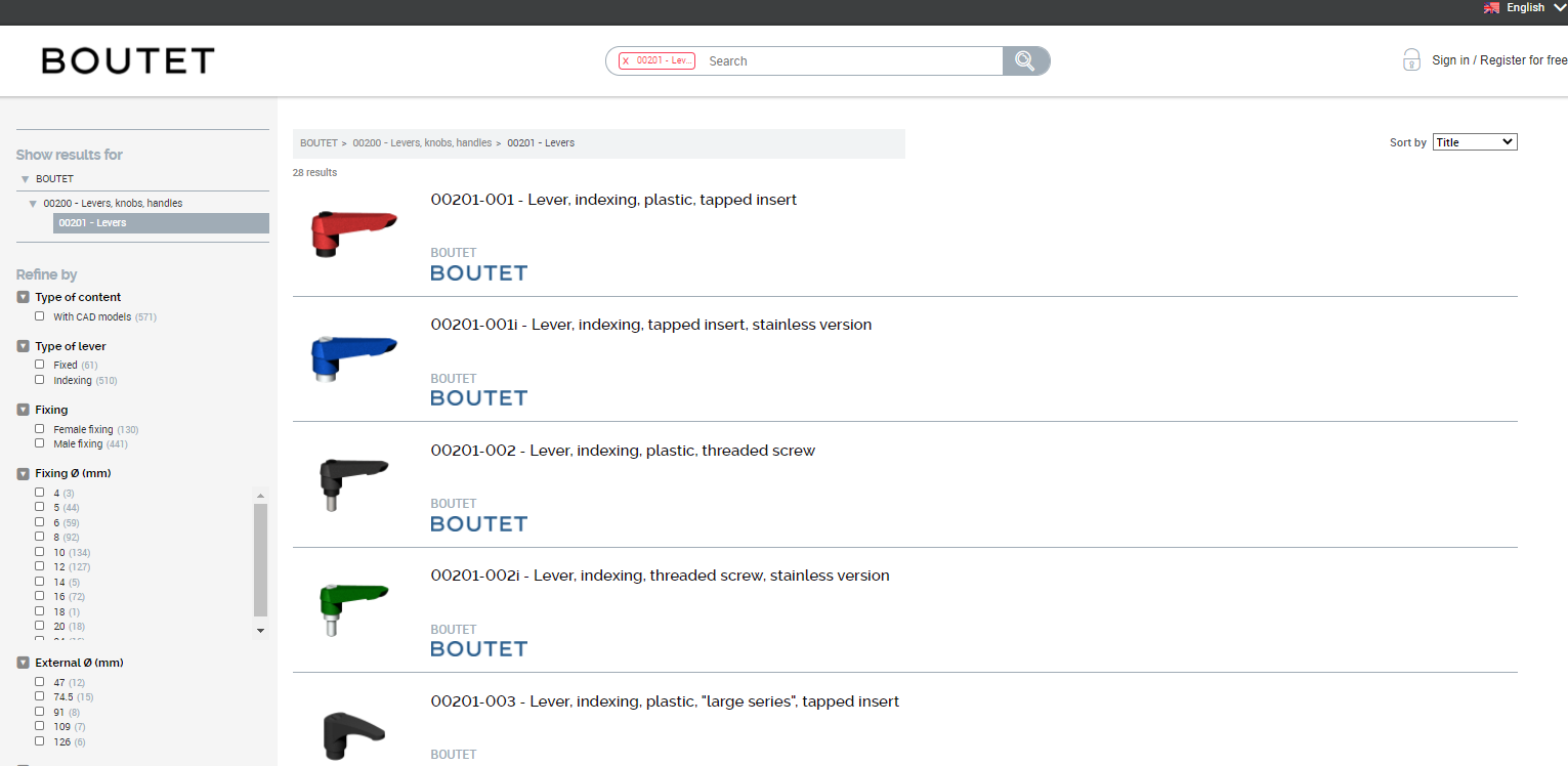 Si le “catalogue bleu” de BOUTET est encore nécessaire et très demandé, particulièrement par les services achats des entreprises, la production de catalogues papier en anglais est désormais arrêtée. l’espace anglophone du site www.boutet.fr renvoie directement vers les pages dédiées et en anglais du catalogue en ligne TraceParts.