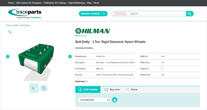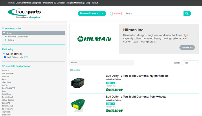 Hilman’s 3D content catalog, containing their chain action rollers and dollies, is now available on the TraceParts website and the TraceParts Publishing Network with access to more than 10,000 CAD files for 170 of Hilman’s most popular products.