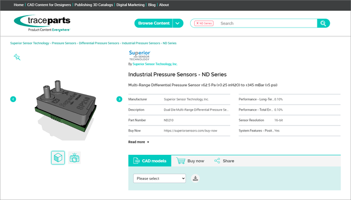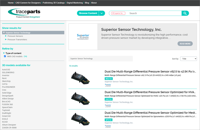 CINCINNATI, OHIO and SANTA CLARA, CALIFORNIA USA (April 22nd, 2021) – Superior Sensor Technology, a manufacturer of advanced differential pressure sensors, has partnered with TraceParts to publish its 3D product catalog.