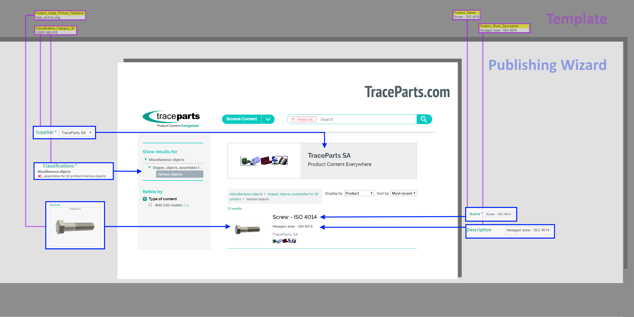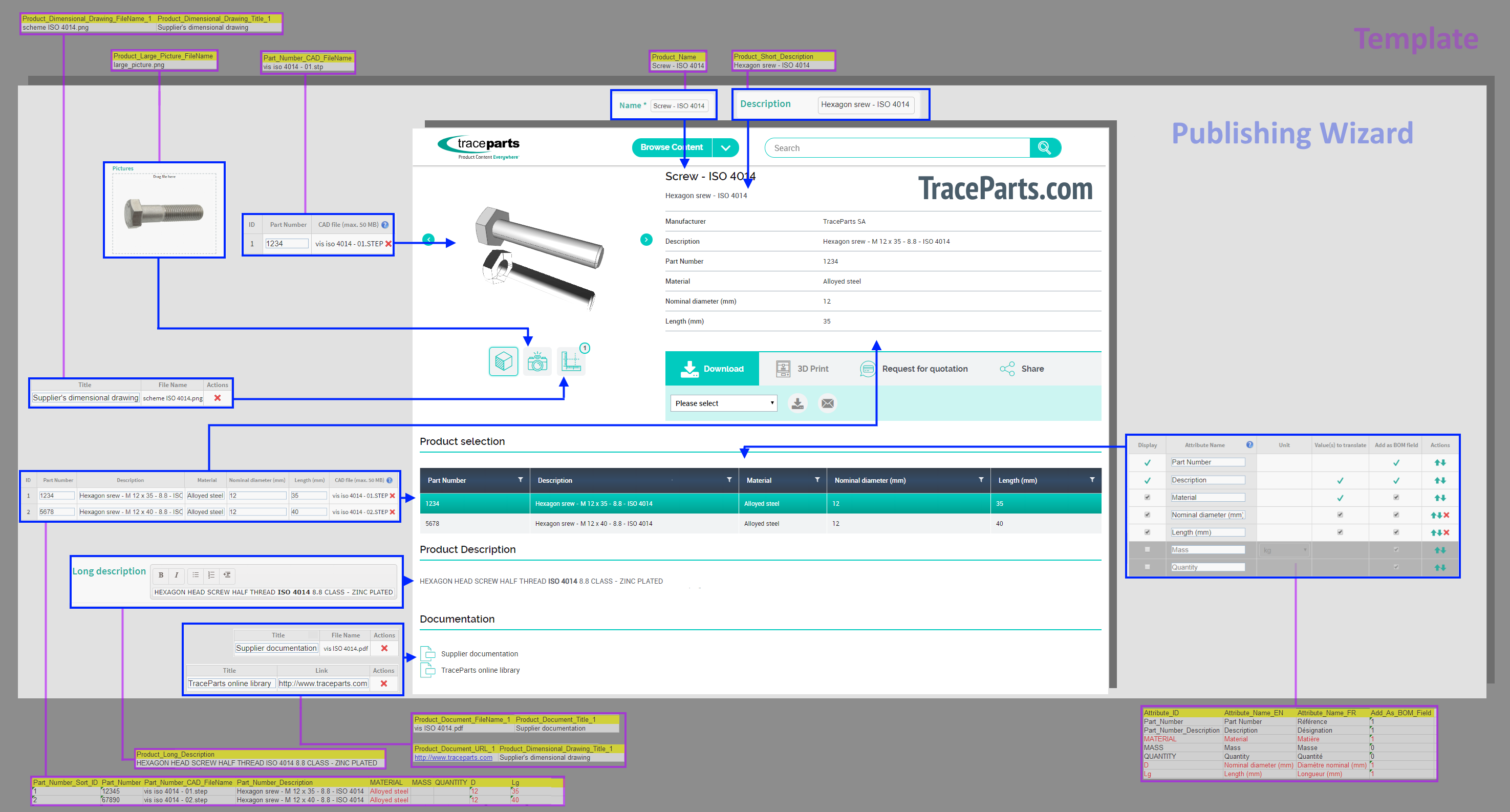 Picture below shows how data from the template and the wizard are used to build and display the product sheet in traceparts.com.