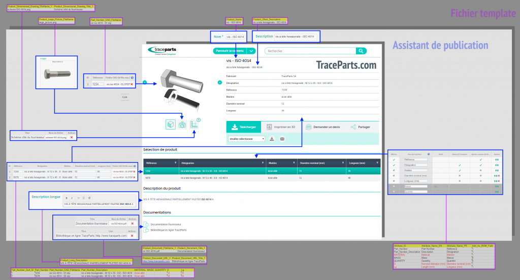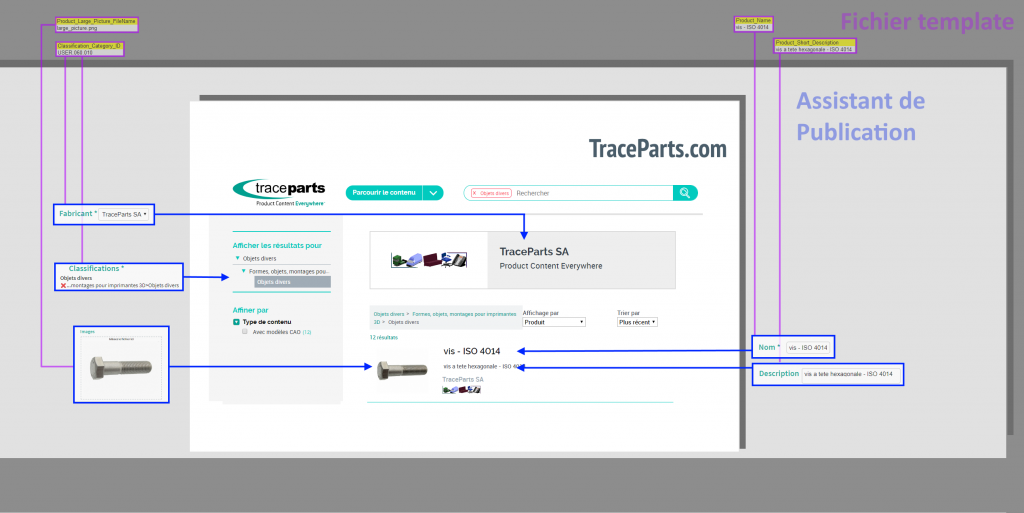 L’image ci-dessous montre comment les données saisies via un fichier template ou l’assistant de création sont utilisées pour créer la fiche produit de traceparts.com.