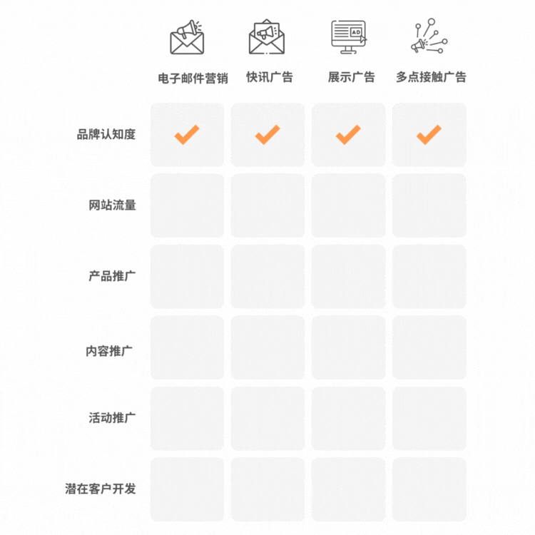 - 跨渠道多点接触广告: 通过定向广告、电子邮件营销活动等方式扩大受众范围——确保买家旅程各个阶段均能多渠道展示您的品牌。