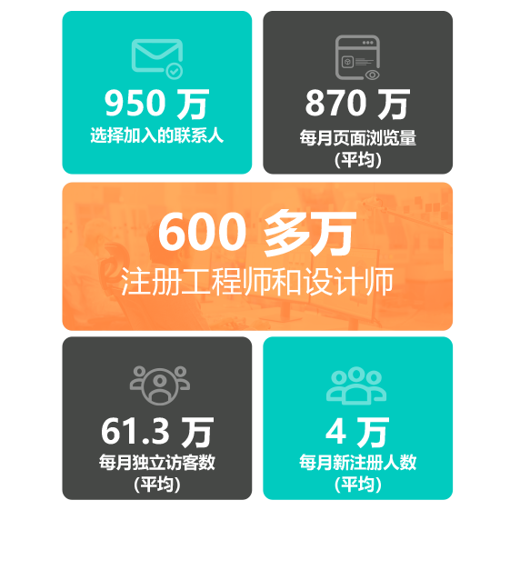 - 定向电子邮件营销: 从 950,000 多名选择加入的工程师和设计师中选择您的目标受众。开发潜在客户、增加网站流量并推广您的产品。
